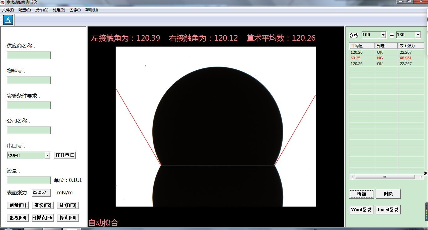 l 接触角分析方法:全自动分析接触角度及手动选点测量。